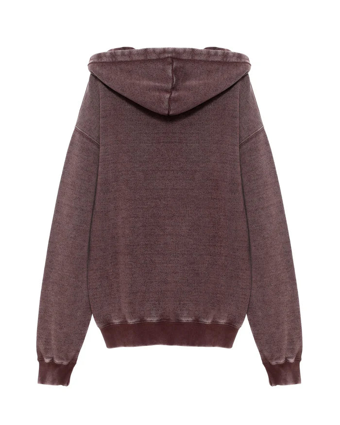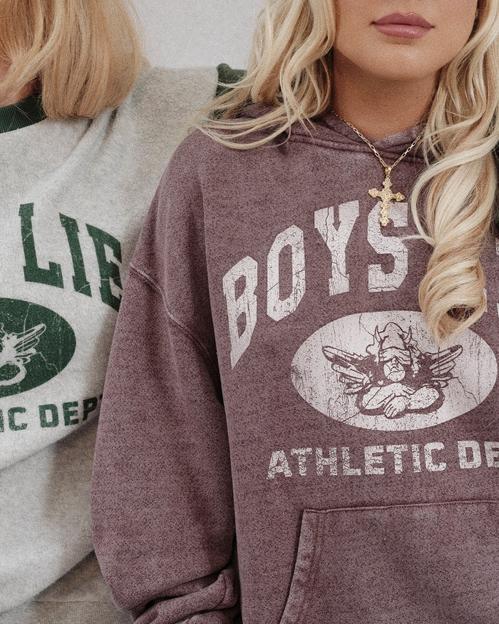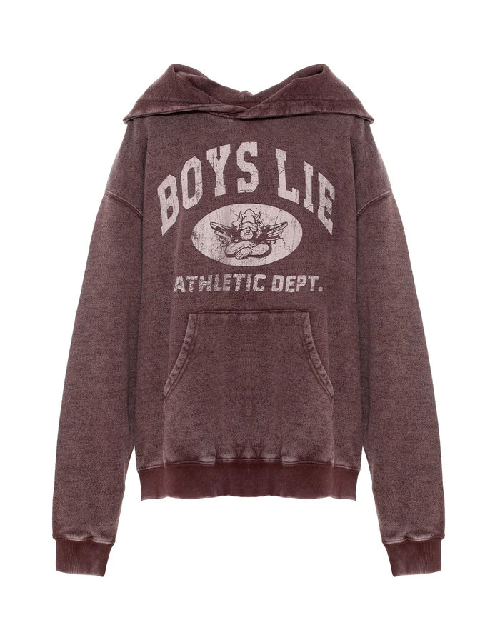 Washed plum hoodie with vintage-inspired Boys Lie Athletic Dept. graphic and signature cherub logo at center