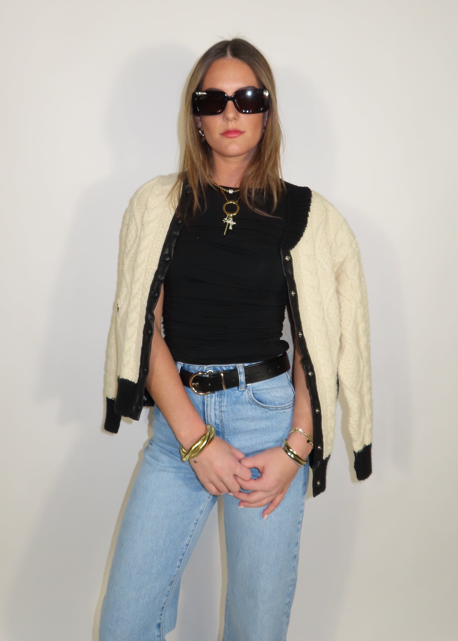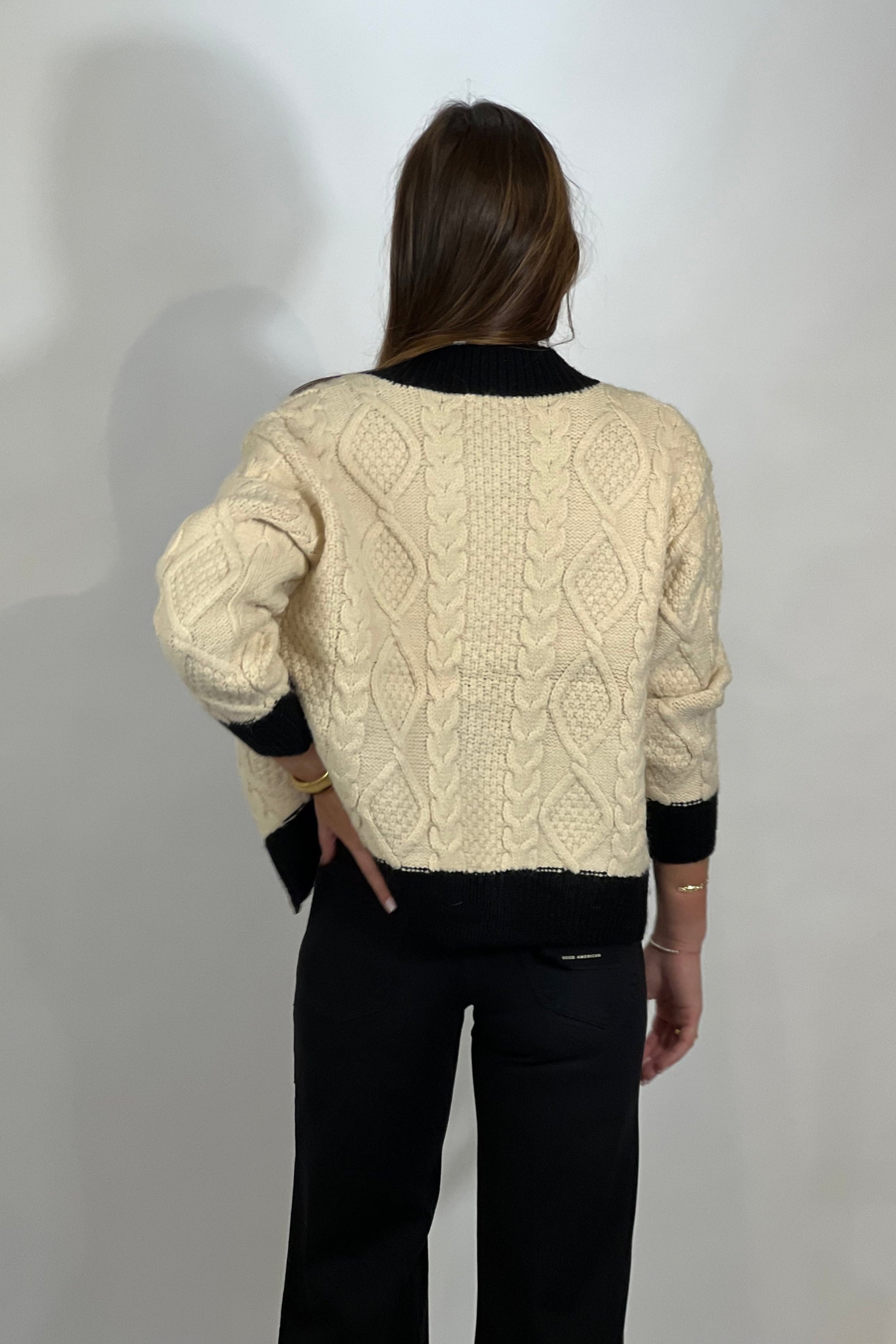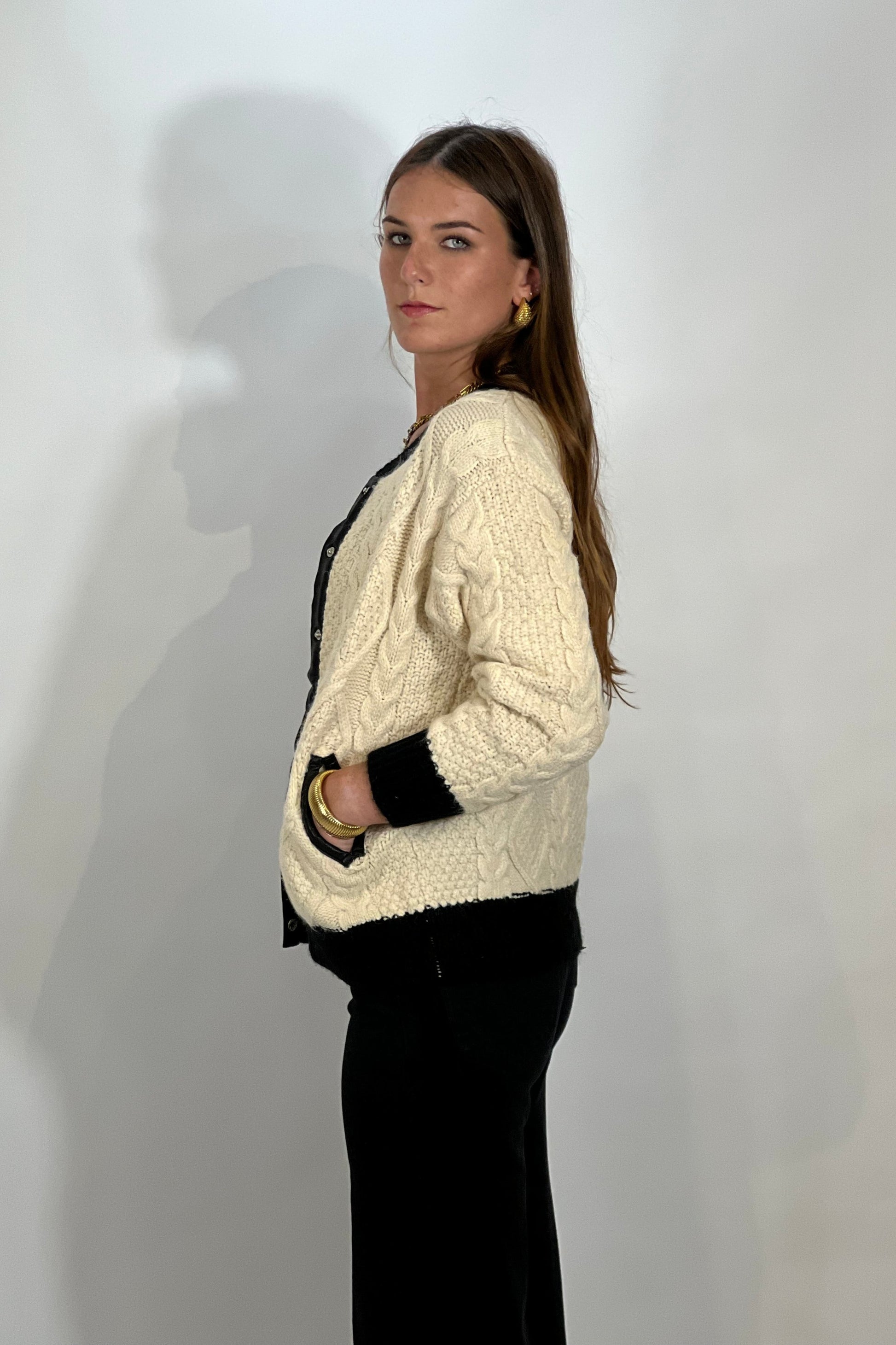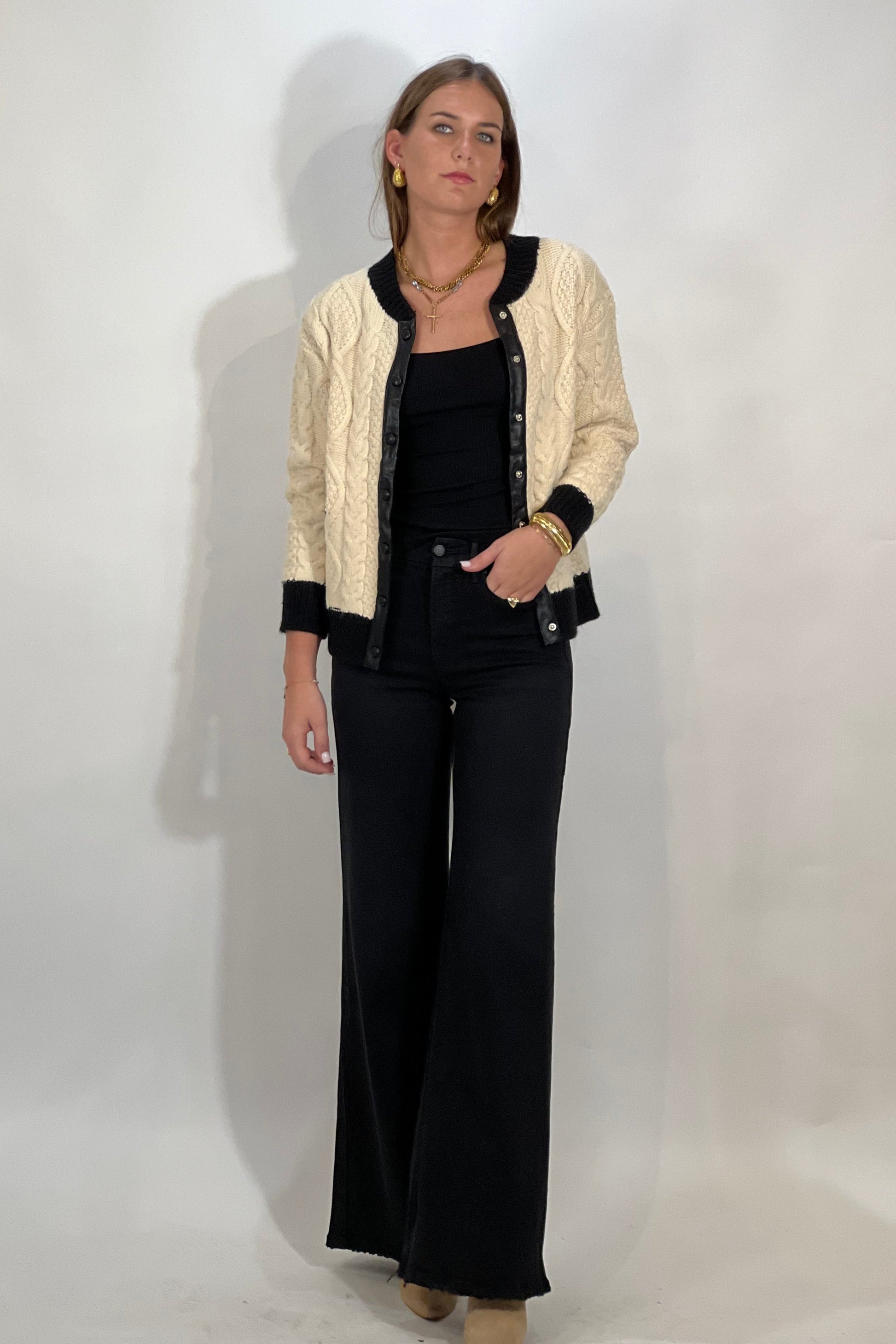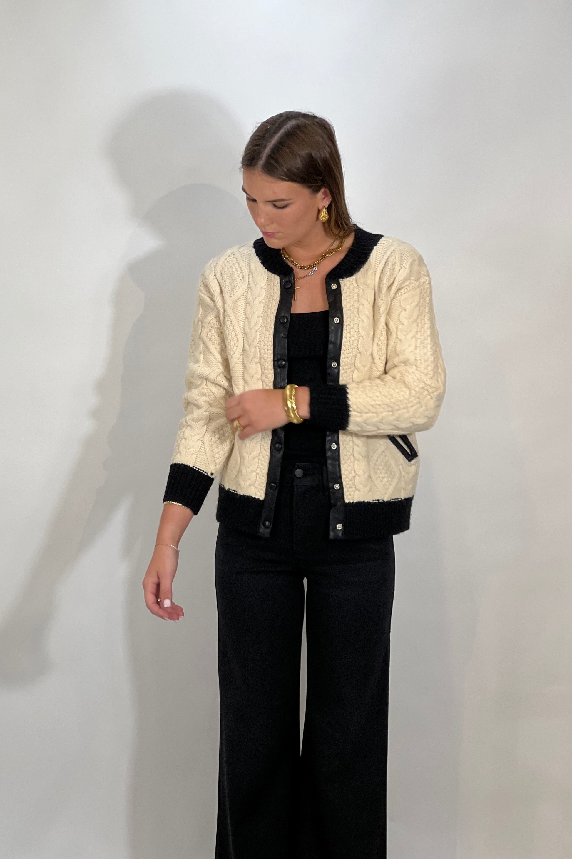 The Caleb Cardi is knit with a chunky cable stitch running down the body with contrast rib at neck, cuff and sweep. It features a faux leather combo placket at center front.