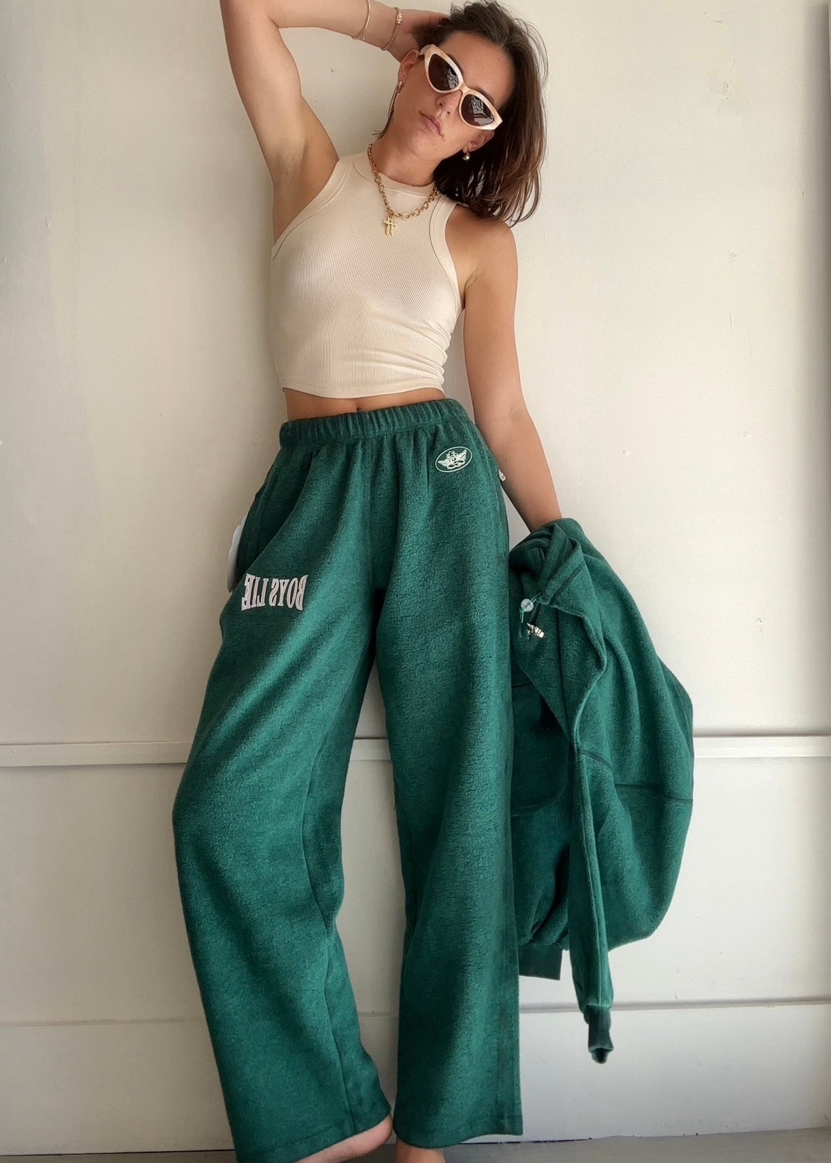 Stay cozy in these Boys Lie forest green fleece pants. Featuring a relaxed, wide-leg fit and an elastic waistband, they offer all-day comfort without sacrificing style. Subtle embroidered logos on the front add a clean, sporty touch to the soft, cozy silhouette.