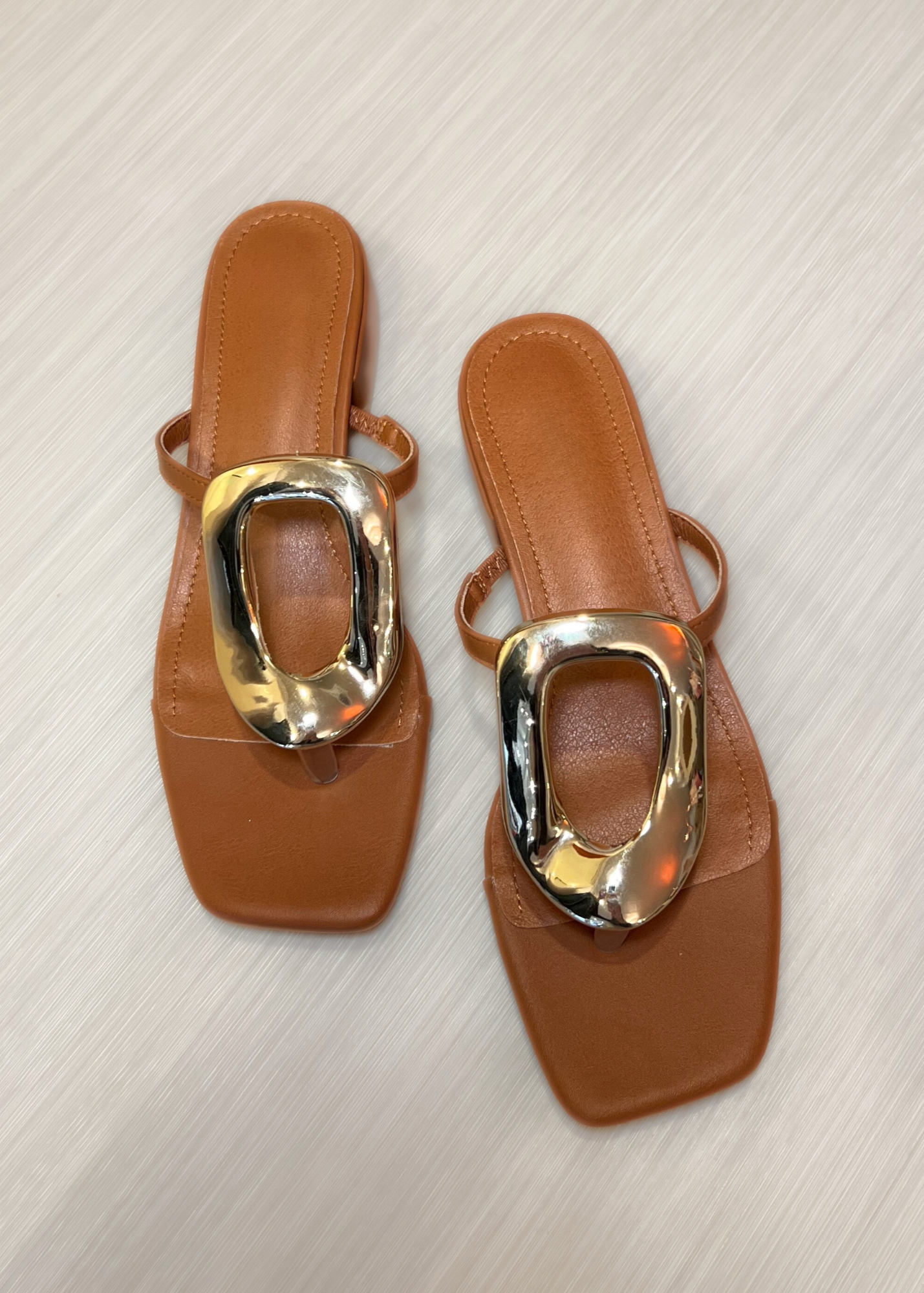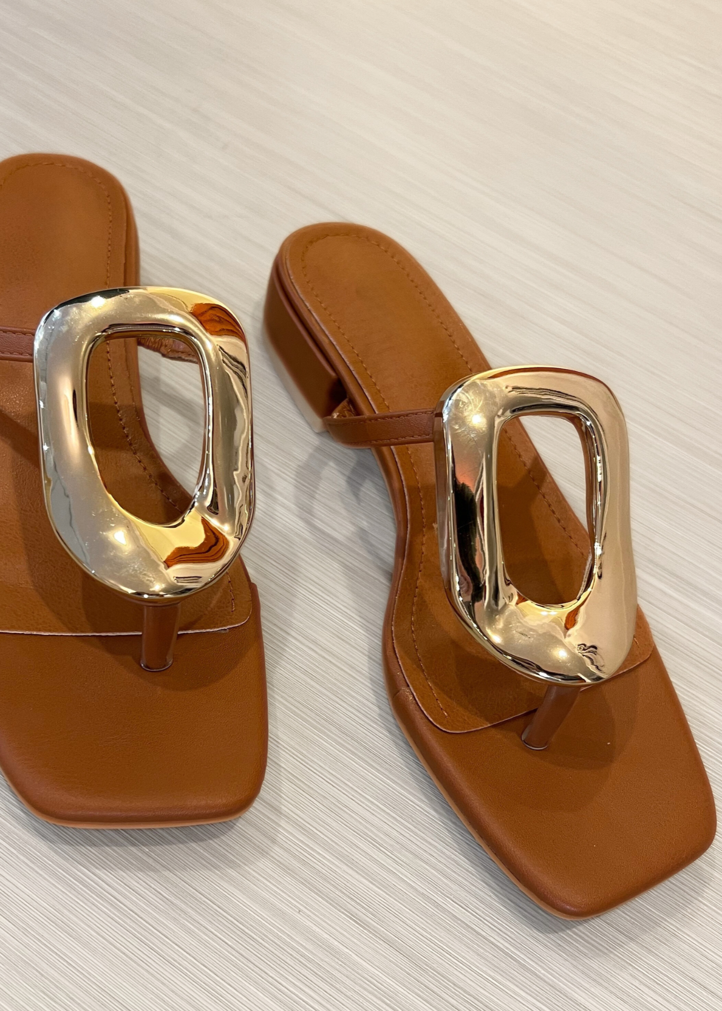 The Laken Sandal is a fresh take on the classic flip-flop, featuring a sleek tan design with a chic gold ring detail on top. The one-inch block heel adds just the right amount of lift, making it perfect for effortlessly dressing up any outfit.