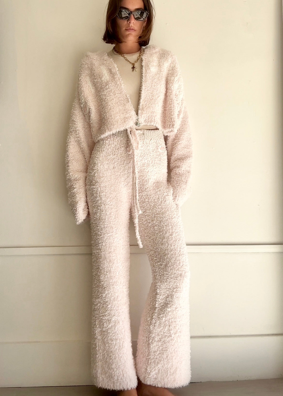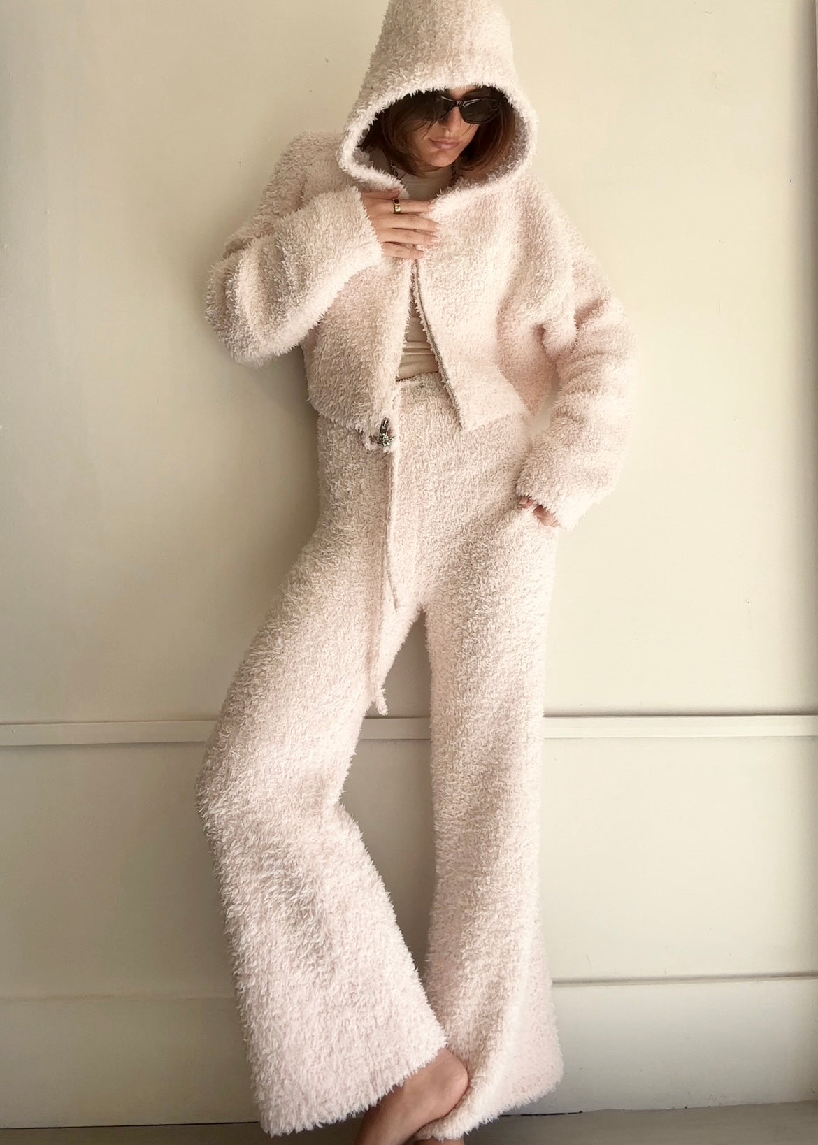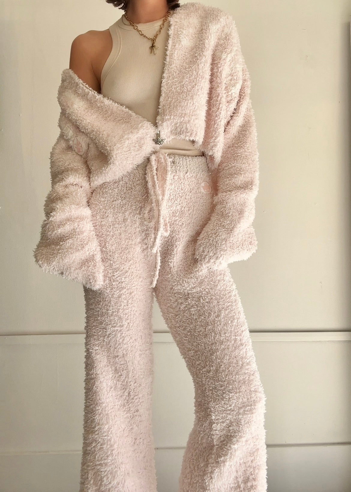 These Boys Lie wide-leg pants are crafted from ultra-soft plush fabric in two tones of light pink, creating a dreamy, cozy look. A small light pink patch at the front adds a delicate, charming detail to the relaxed, flowy silhouette. Pair them with the matching Boys Lie hoodie and bralette for the ultimate coordinated set.