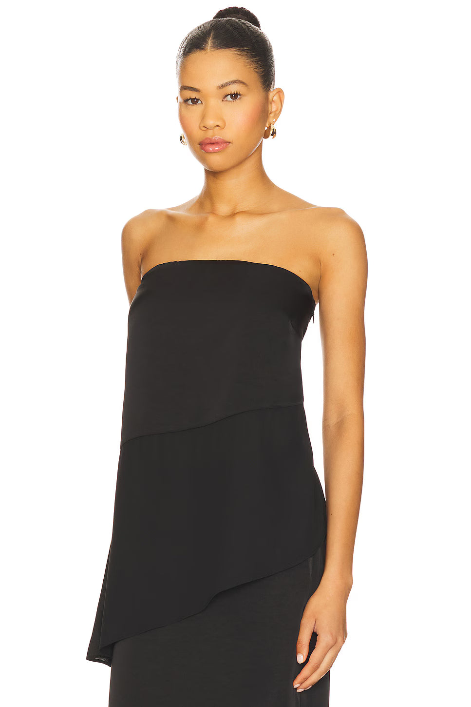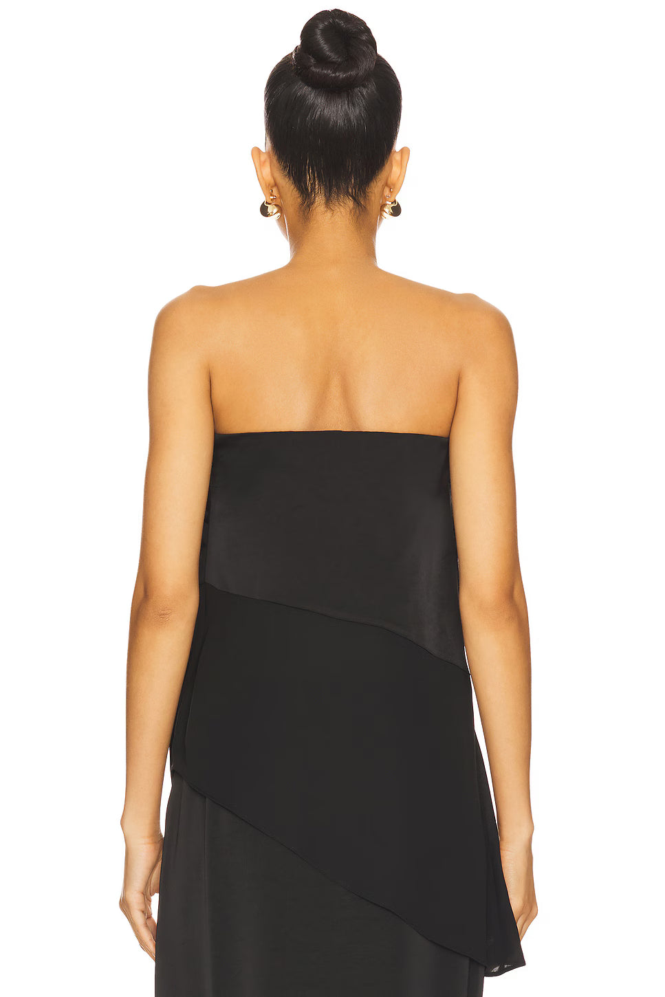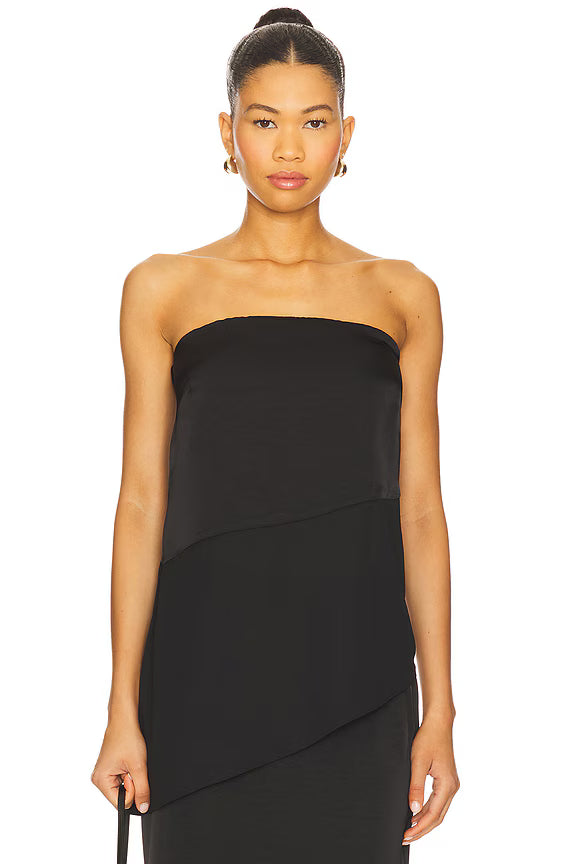 The Marcia Top is a sleek black strapless style that blends elegance with an edgy twist. Crafted from lightweight satin and fully lined through the bodice for a smooth, secure fit, it features a sheer mesh asymmetrical hem that adds dimension and movement. Perfect for pairing with a skirt, or your best denim!
