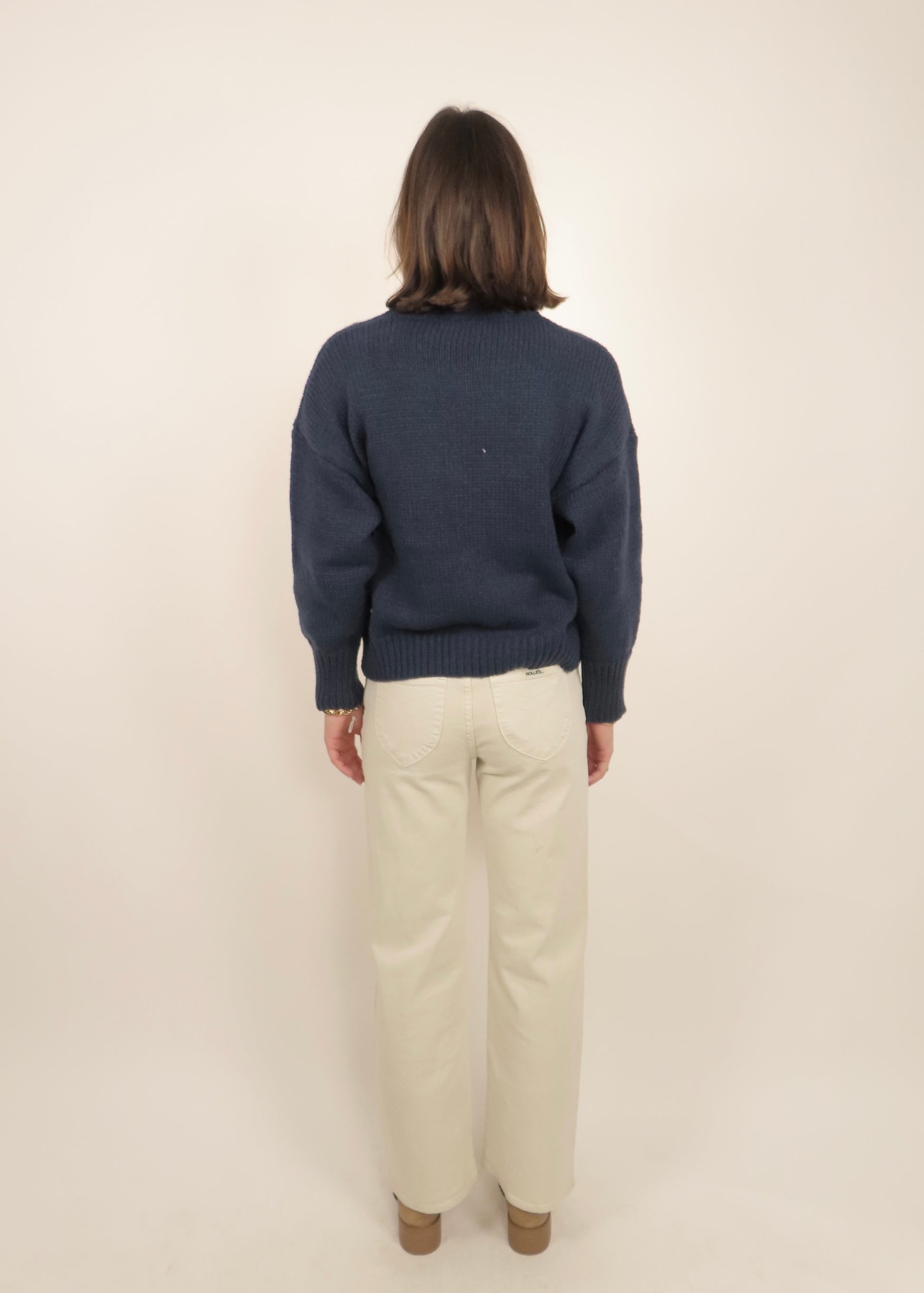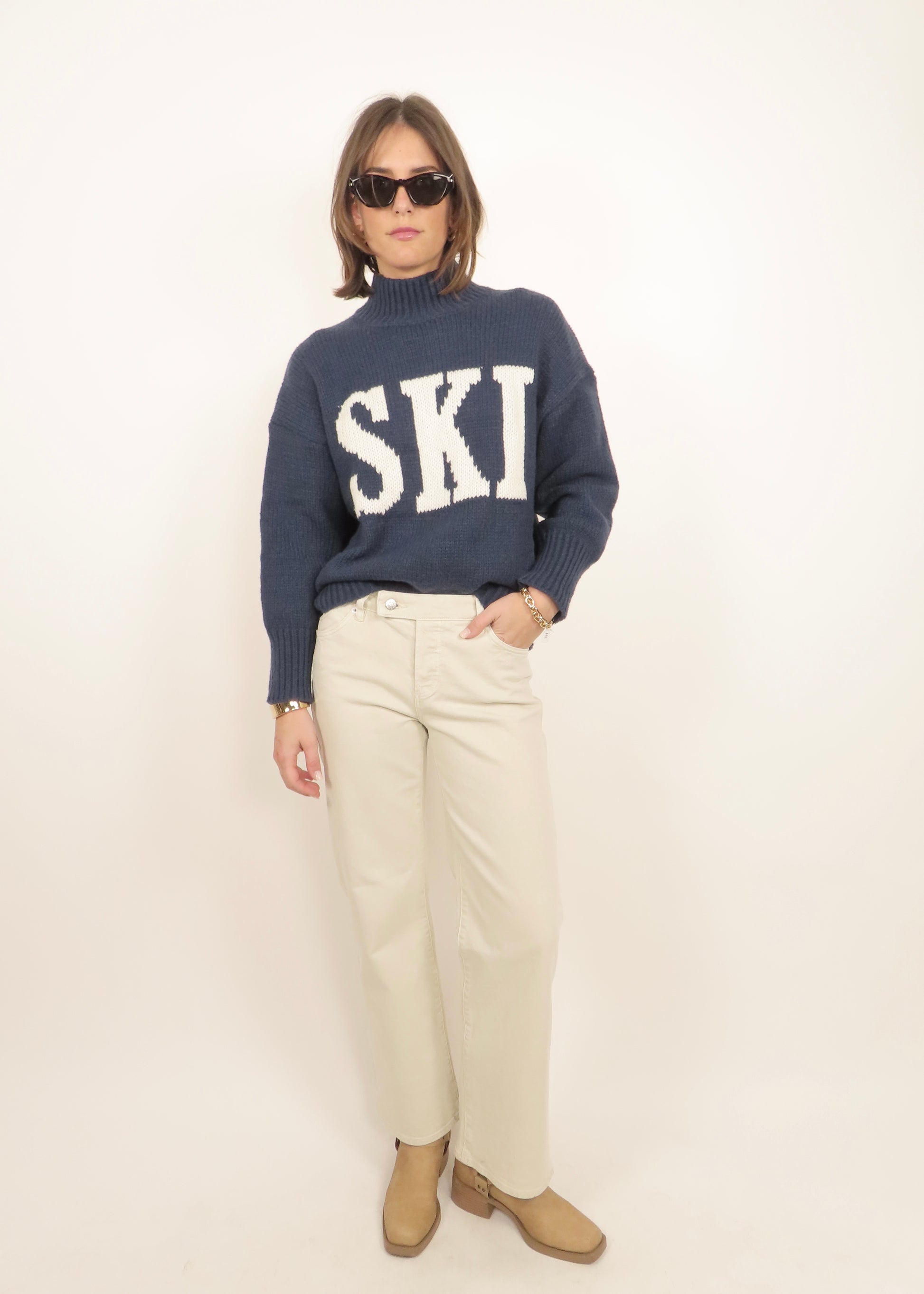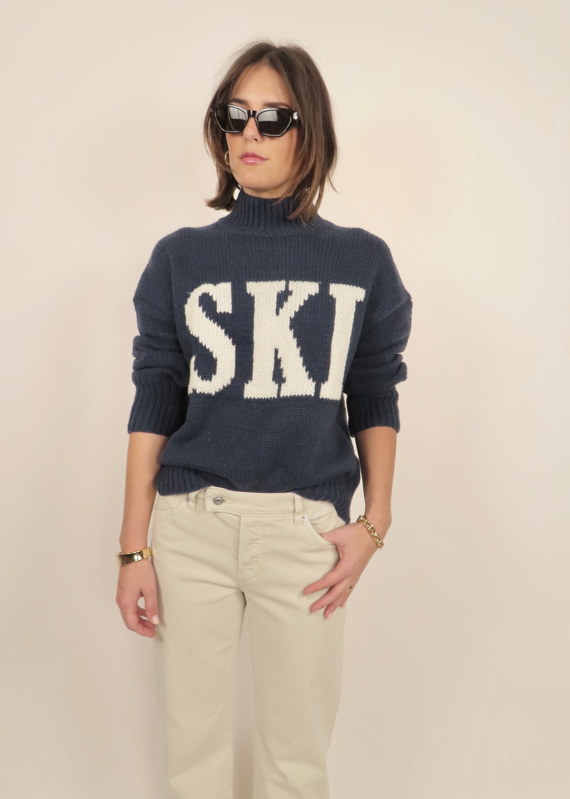Chunky navy mock neck sweater featuring a relaxed fit with SKI written across the front in white. Designed with ribbed cuffs and hem for a structured finish.
