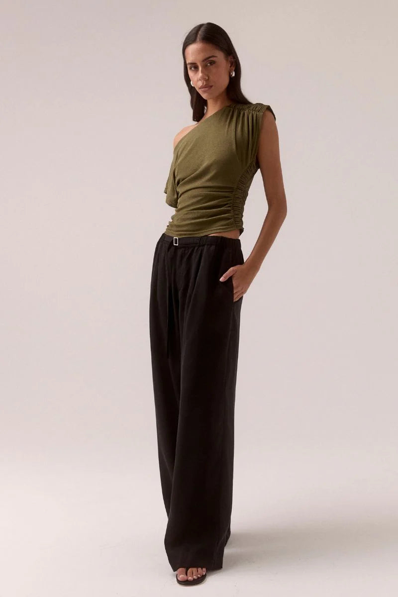 An off-shoulder mesh top with a gathered, body-hugging fit. Designed with short sleeves, a boat neckline, and asymmetrical ruched panel detailing. Fully lined with stretch for comfort.