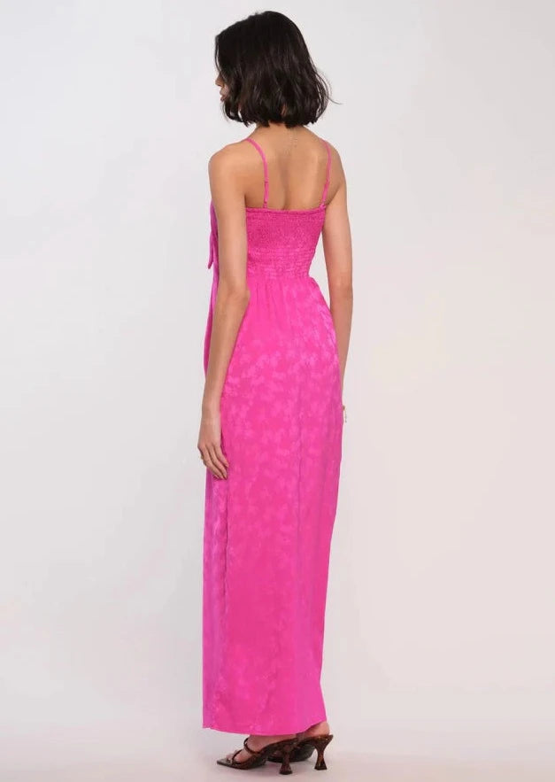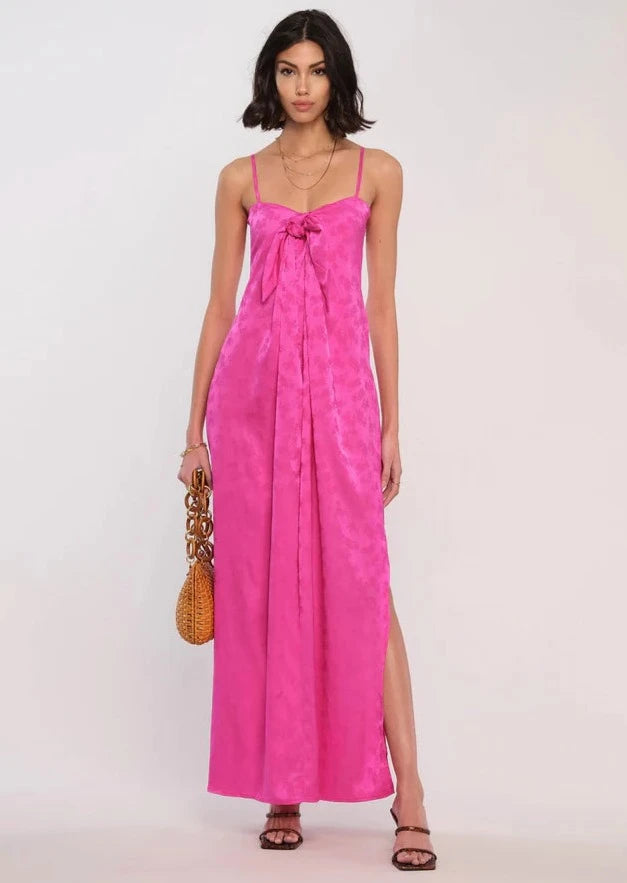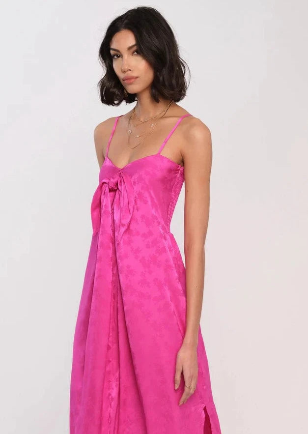 The Tanner Dress is a simple slip silhouette with a bow at the front bust. It's crafted from a silky satin jacquard.