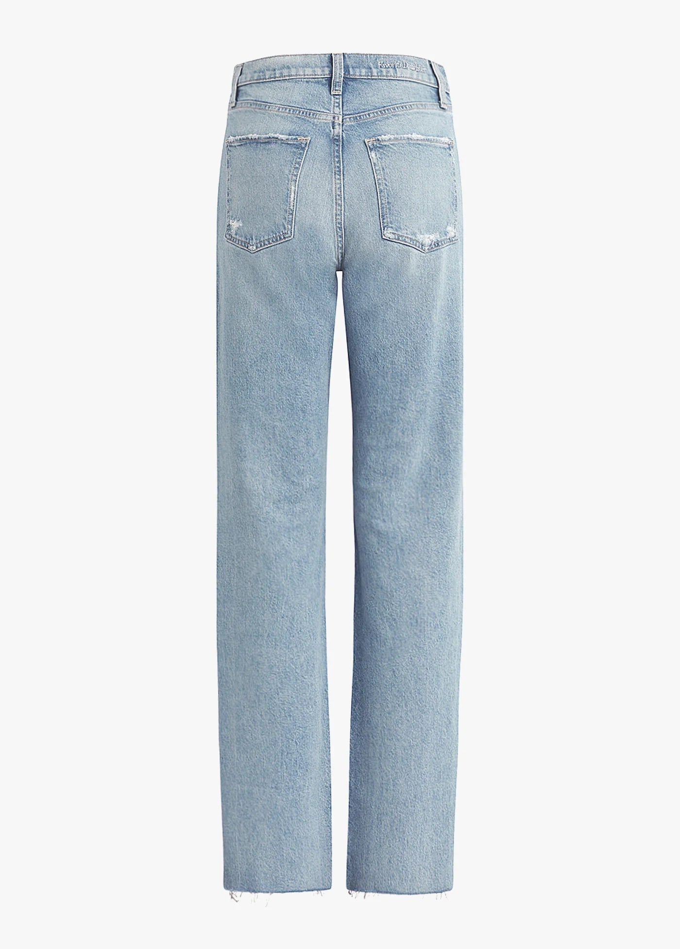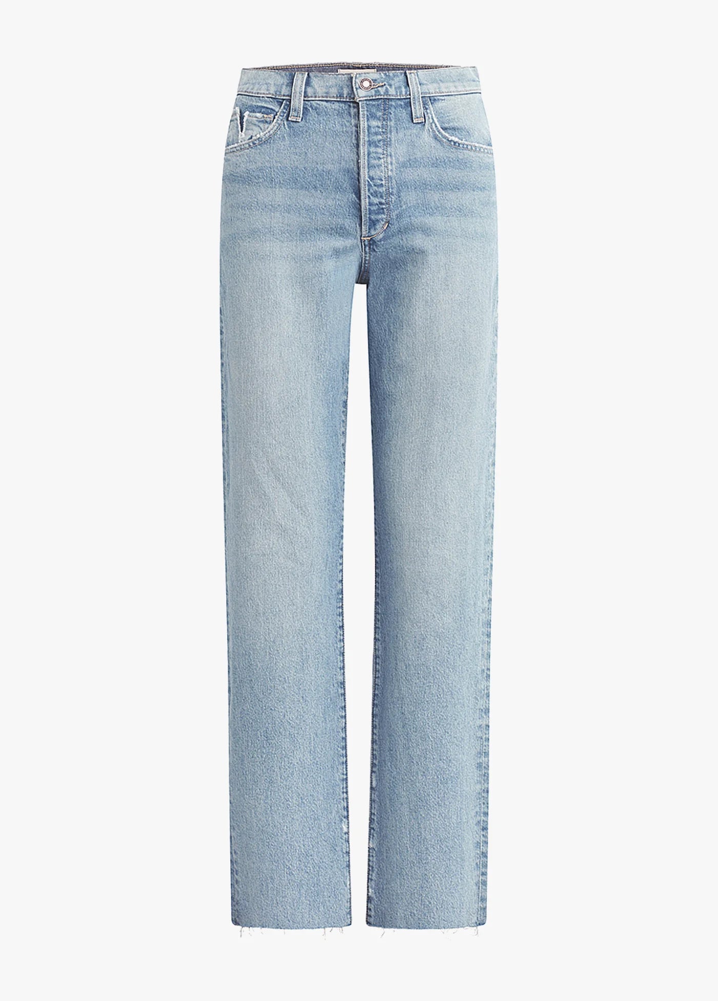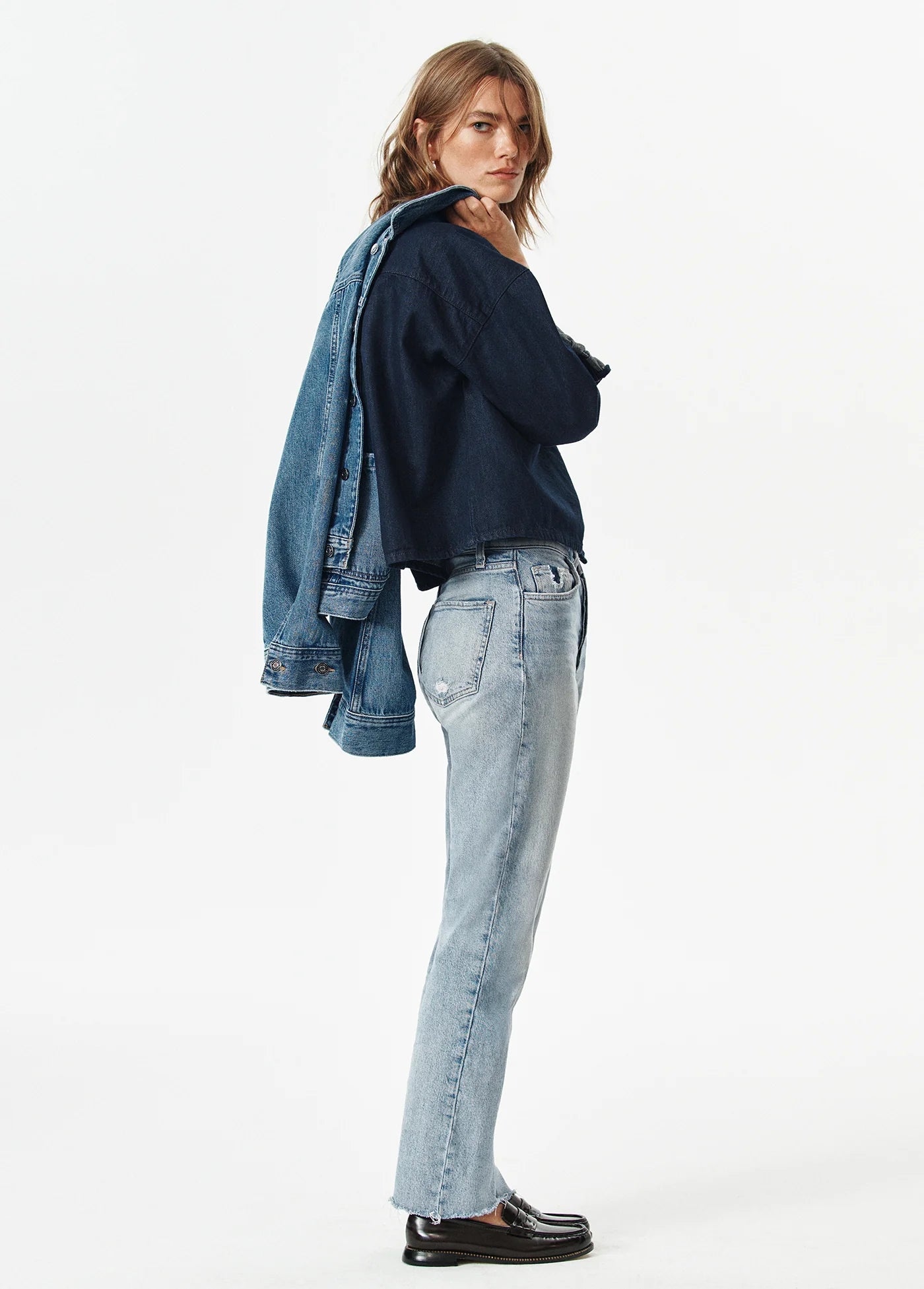 Relaxed high-rise boyfriend jeans in a sun-kissed light blue wash. Designed with a slightly dropped crotch, relaxed straight legs, and a flattering fit at the waist and hips. Perfectly balanced for a casual, vintage-inspired look.