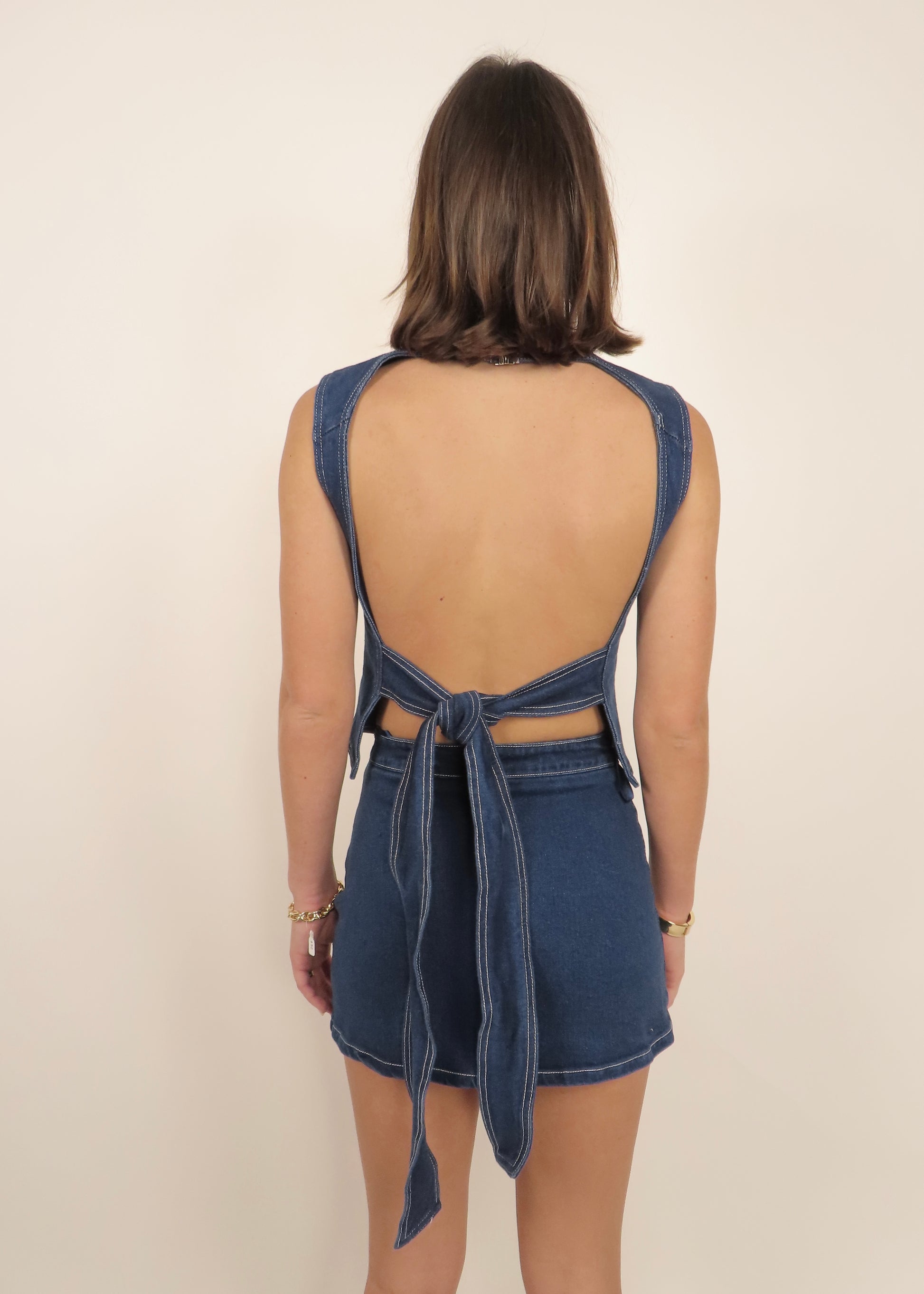 Structured dark denim mini skirt with a back zipper for a tailored fit. Designed to pair perfectly with the Rodeo Tank for a coordinated look.