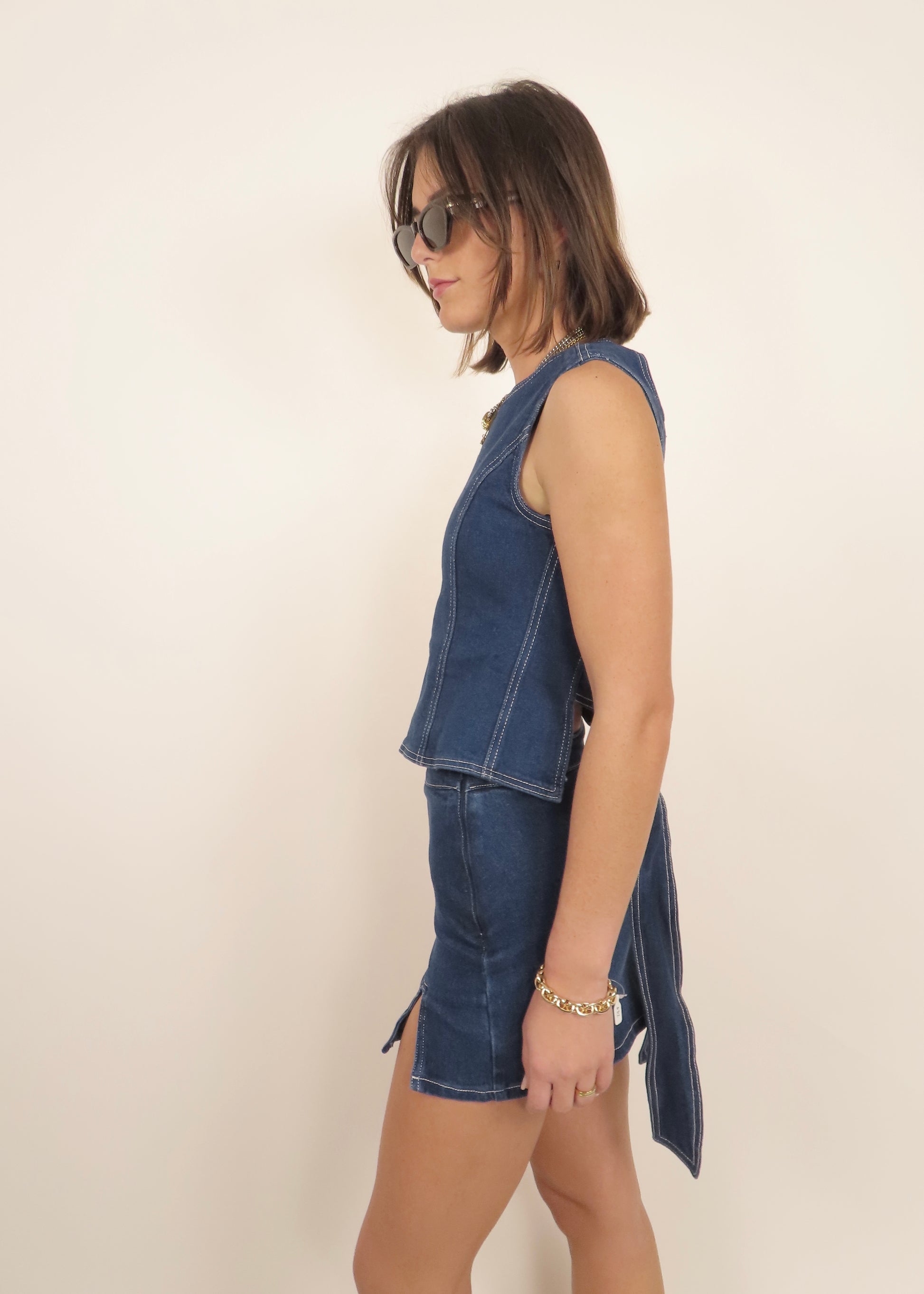 Structured dark denim tank with an open back and adjustable tie for the perfect fit. Designed with a fitted shape and clean seams. Pairs with the matching Rodeo Mini for a complete look.