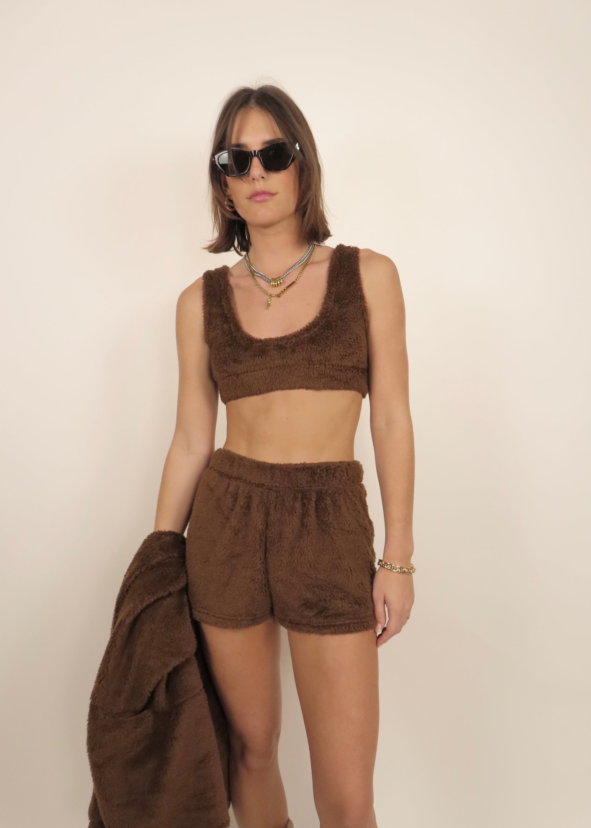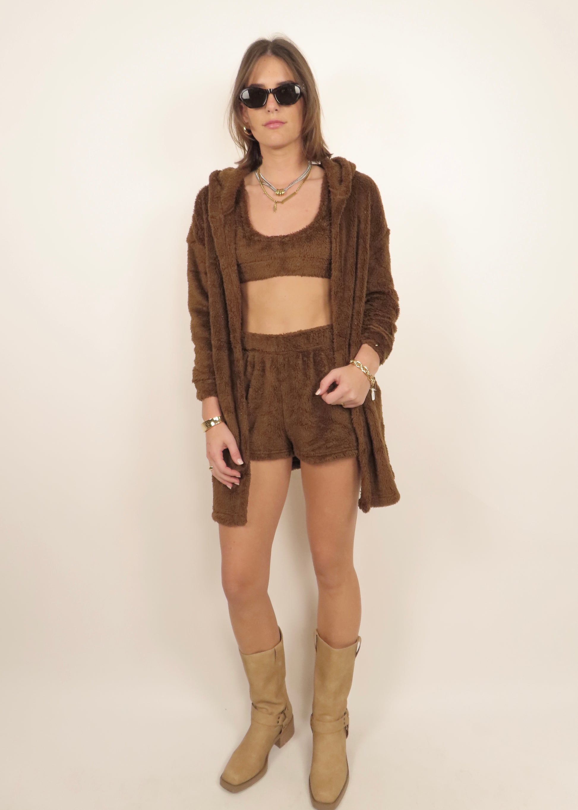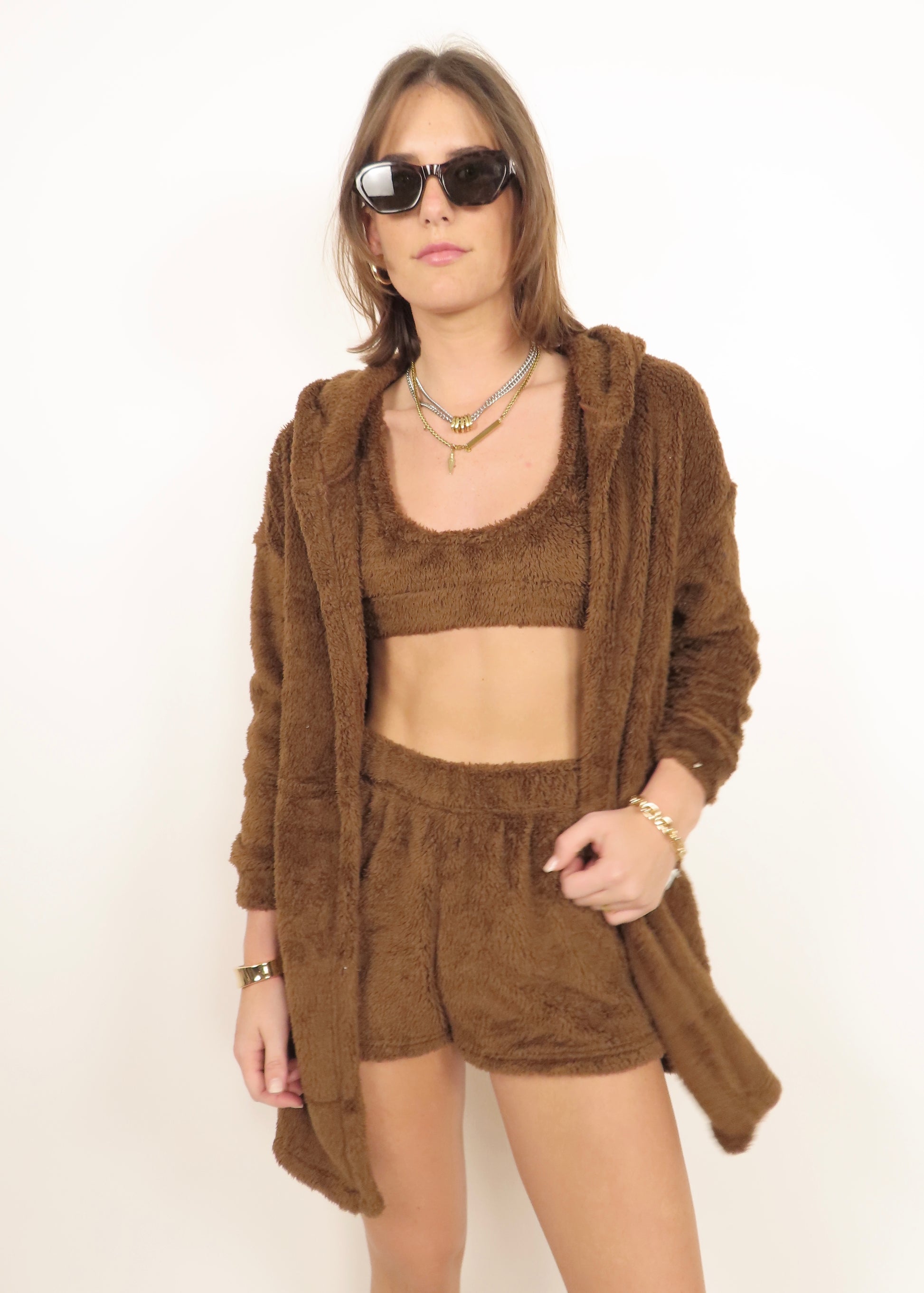 Light brown three-piece teddy set in ultra-soft plush fabric. Includes a bralette, matching shorts, and a cozy robe for complete comfort and lounge-ready style.