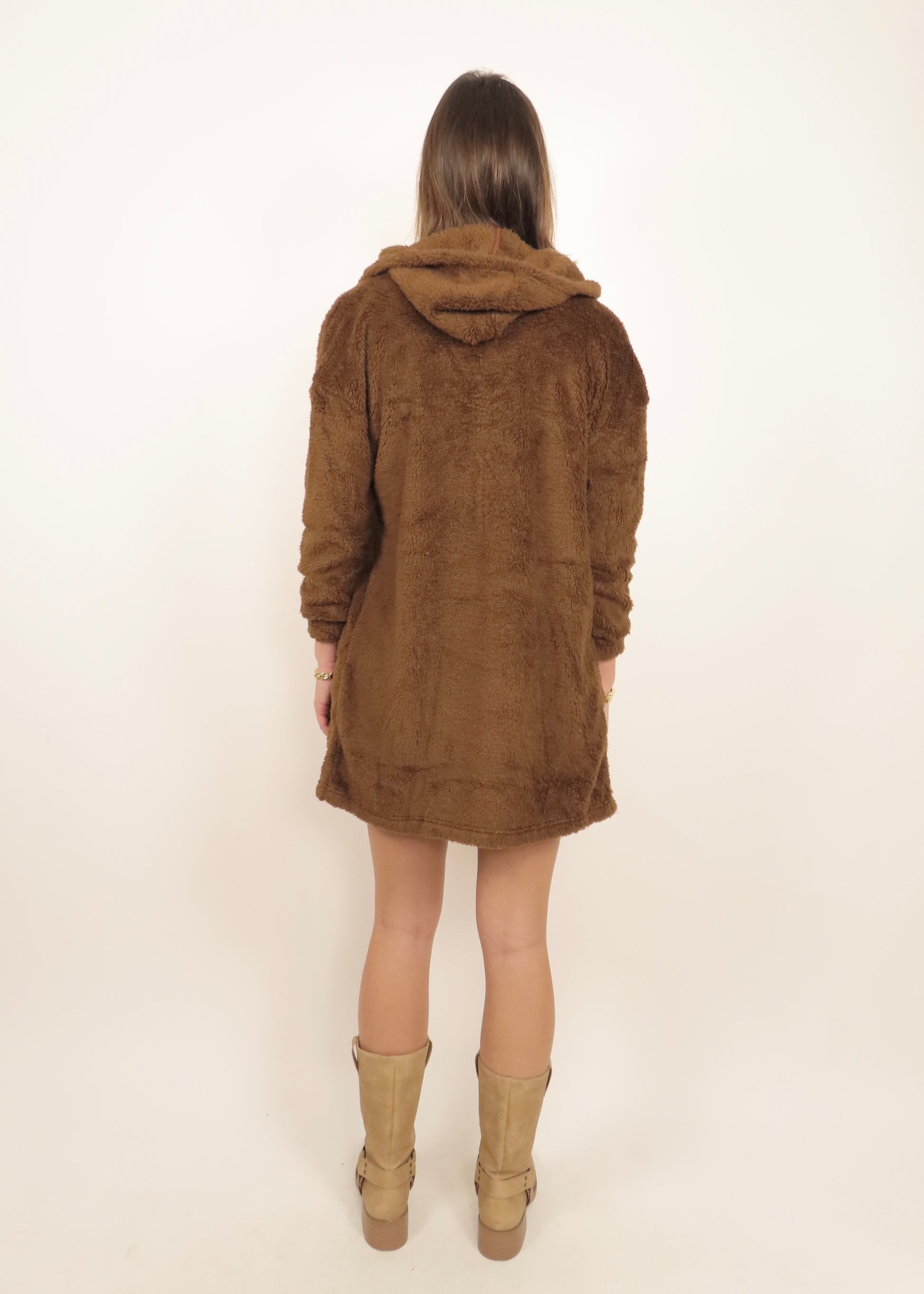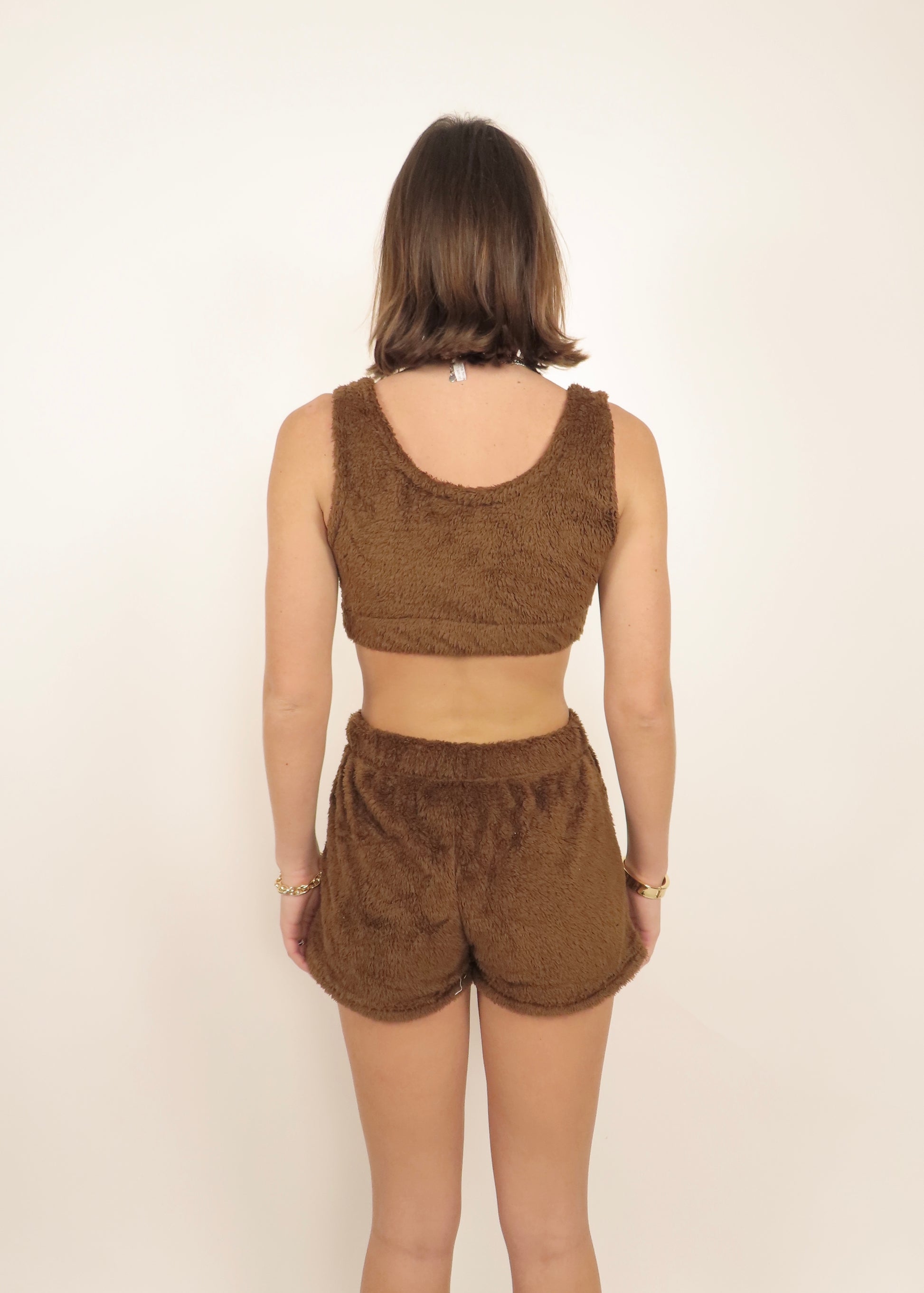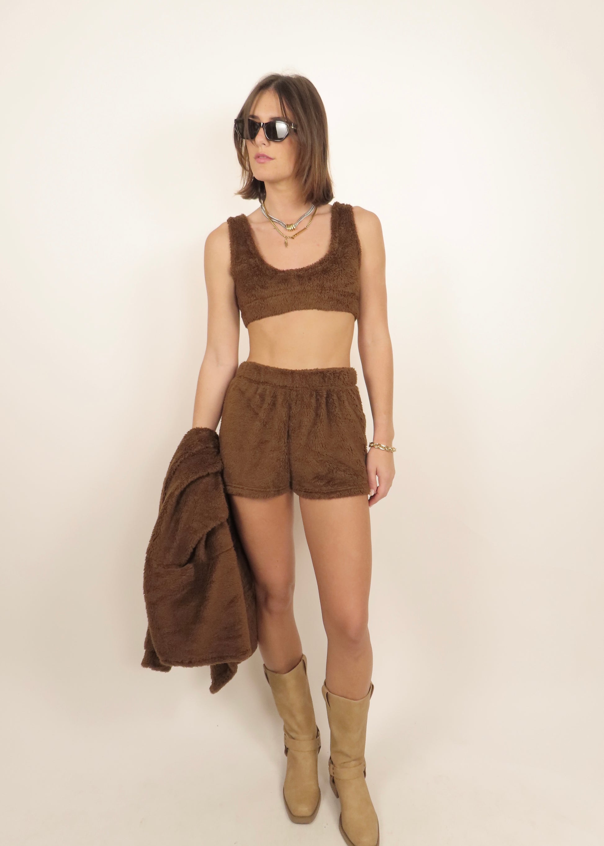Light brown three-piece teddy set in ultra-soft plush fabric. Includes a bralette, matching shorts, and a cozy robe for complete comfort and lounge-ready style.